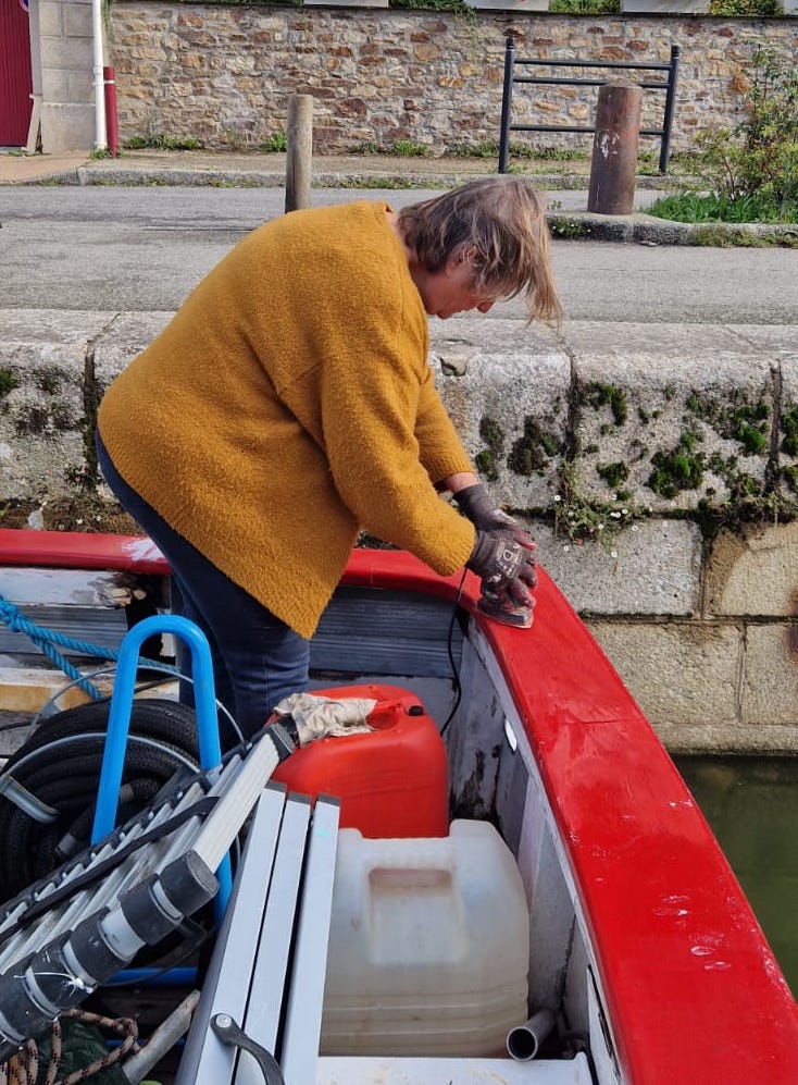 Une part importante de la remise en état d’Accalmie a porté sur la peinture. En complément des travaux de charpente, il a fallu nettoyer, gratter, poncer, décaper puis appliquer mastic et enduits avant de passer les nombreuses couches de peinture qui lui donnent aujourd’hui son allure actuelle. Accalmie est désormais prête à représenter fièrement notre association lors des navigations et manifestations nautiques, pour le plaisir des adhérents et amis. Avis aux volontaires : quelques finitions de peinture restent à faire, des travaux réalisables à flot. Accalmie sera notamment présente à Vilaine en Fête l’an prochain, où nous participerons à l’organisation.