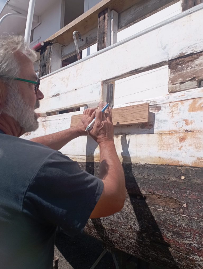 Ce chantier ambitieux s’inscrit sur plusieurs années, sous la conduite de Boris. La première étape a consisté à rendre Accalmie présentable et apte à naviguer en sécurité. La coque est en bon état général ; en revanche, les œuvres mortes ont nécessité le remplacement de plusieurs parties abîmées. À suivre…