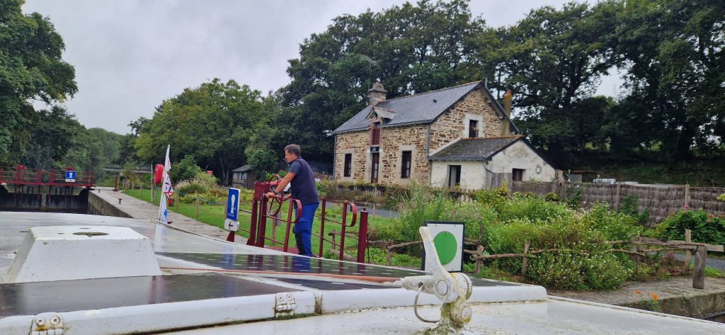 Le canal Nantes à Brest s’étire majestueusement sous une fine pluie qui ne trouble pas la sérénité du voyage. Les navigateurs savourent le silence, les chants d’oiseaux et les paysages verdoyants. Cette étape offre aussi l’occasion de mieux apprivoiser Accalmie, au rythme des écluses et des longs biefs qui dessinent la route vers l’ouest.